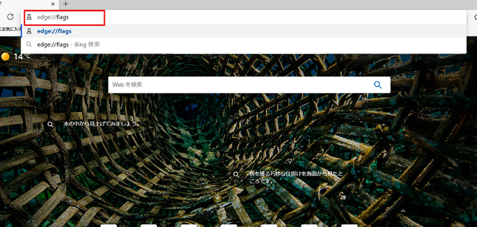 Microsoft Edgeのアドレスバーに"edge://flags"とタイプする。