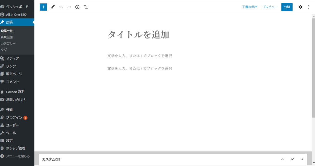 一方、自分の投稿スクリーンの場合ですが、下の画像は新規追加ボタンをクリックした直後の画面です。